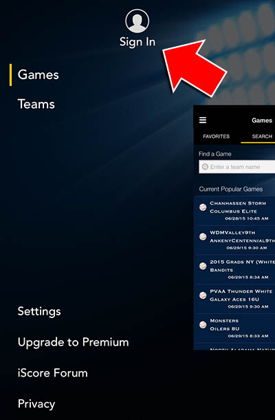 - If the icon at the top says "Sign In" then you are not logged into iScore Central. If you are not signed in, press the "Sign In" to reveal the Login screen